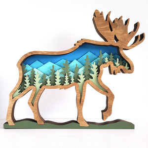 The details in this wood-layered moose art piece are unique. It will look great in your home, office, or cabin. The seven layers are each a distinctive color that blends in a series of blues and greens to create depth and dimension.