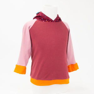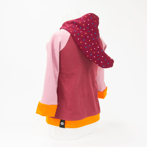 It's the go-to hoody for both lads and lasses. This pullover Elf Hoodie features a lined, pointy hood and contrasting sleeve cuffs. A generous fit allows the hoody to be worn more extended before it is outgrown and passed on. Your little one will stand out in the crowd. Made in Montana from upcycled deadstock fabric, this hoodie blends sustainability with style. If you are looking for older sizing, check out the Joey Hoodie!
