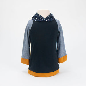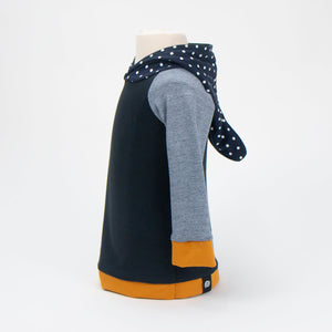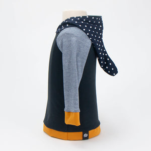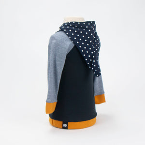 It's the go-to hoody for both lads and lasses. This pullover Elf Hoodie features a lined, pointy hood and contrasting sleeve cuffs. A generous fit allows the hoody to be worn more extended before it is outgrown and passed on. Your little one will stand out in the crowd. Made in Montana from upcycled deadstock fabric, this hoodie blends sustainability with style. If you are looking for older sizing, check out the Joey Hoodie!