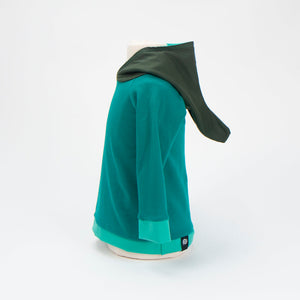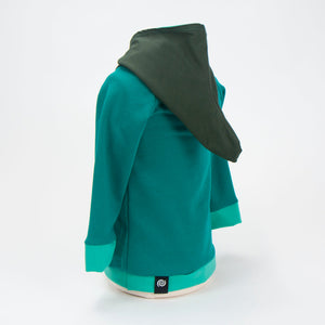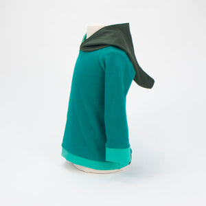 It's the go-to hoody for both lads and lasses. This pullover Elf Hoodie features a lined, pointy hood and contrasting sleeve cuffs. A generous fit allows the hoody to be worn more extended before it is outgrown and passed on. Your little one will stand out in the crowd. Made in Montana from upcycled deadstock fabric, this hoodie blends sustainability with style. If you are looking for older sizing, check out the Joey Hoodie!