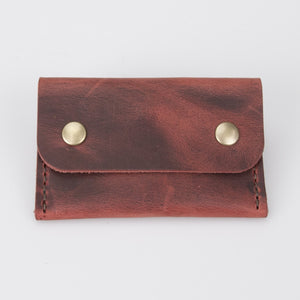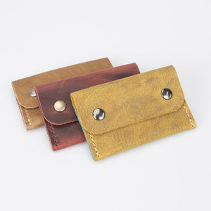 This minimalist single-pocket snap wallet is crafted from American leather with accent stitching, an accent color spacer, and a double snap closure. It fits credit cards and business cards and fits neatly in your pocket. Color options are listed, and you can always check "surprise" for a random option too!
