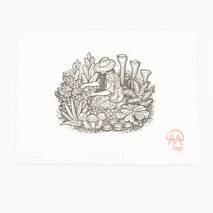 This print depicts a woman foraging for mushrooms and other plants. The artist's partner inspired this art piece.
