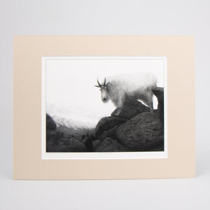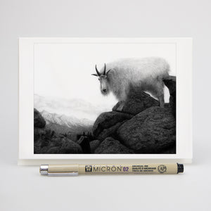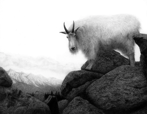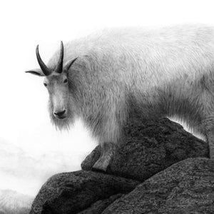 Above the Cloudsis a fine art print of a mountain goat standing atop a rugged peak, reproduced from an original graphite pencil drawing. Mountain goats (Oreamnos americanus) are the quintessential alpine animals, perfectly adapted to life above the timberline with thick coats, balanced builds, and splayed hooves. The title reflects their remarkable ability to thrive at altitudes above 10,000 feet, truly living life above the clouds.