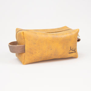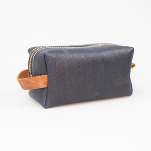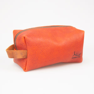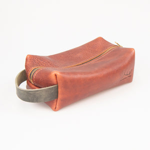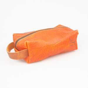 This Dopp kit could be a shaving, make-up, or toiletries bag. The leather tab and handle make for easy carrying and easy zipping and unzipping. Perfect for travel, it’s durable and eye-catching.