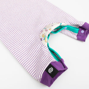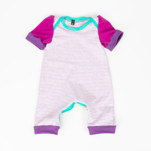Say hello to your new baby essential! These adorable short-all rompers are a must-have, featuring lapped shoulders, a cozy crew neck, a contrasting butt gusset, and easy-to-use resin snap closures for quick changes. Available in playful unisex and girl-friendly color combos, they're guaranteed to steal the show at your next family gathering. Crafted in small, exclusive batches (think microbrewery vibes!) from upcycled deadstock fabric, they're as sustainable as they are stylish.