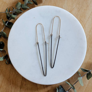These earrings are simple with an edge. The steel wire is reclaimed and has some beautiful rustic qualities and character that vary from pair to pair. They are lightweight, making them easy to wear, and are made with 14K gold fill (ear wires) and steel. They are hand shaped and forged, and a unique memorable design. Made with love and care!