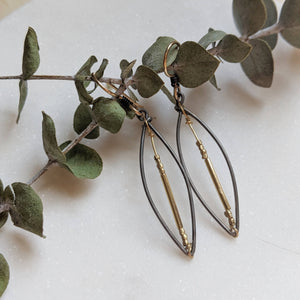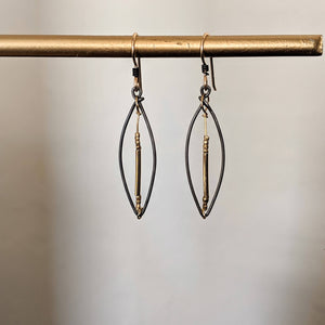 Sweet little earrings. Made with steel, the teeniest little brass beads strung along a wire through the center. Such delicate detail and weightless wearability. The ear wires are 14k gold fill, and are great for sensitive ears!