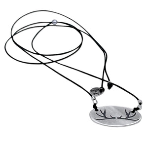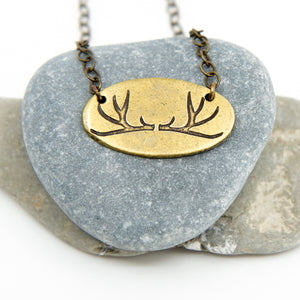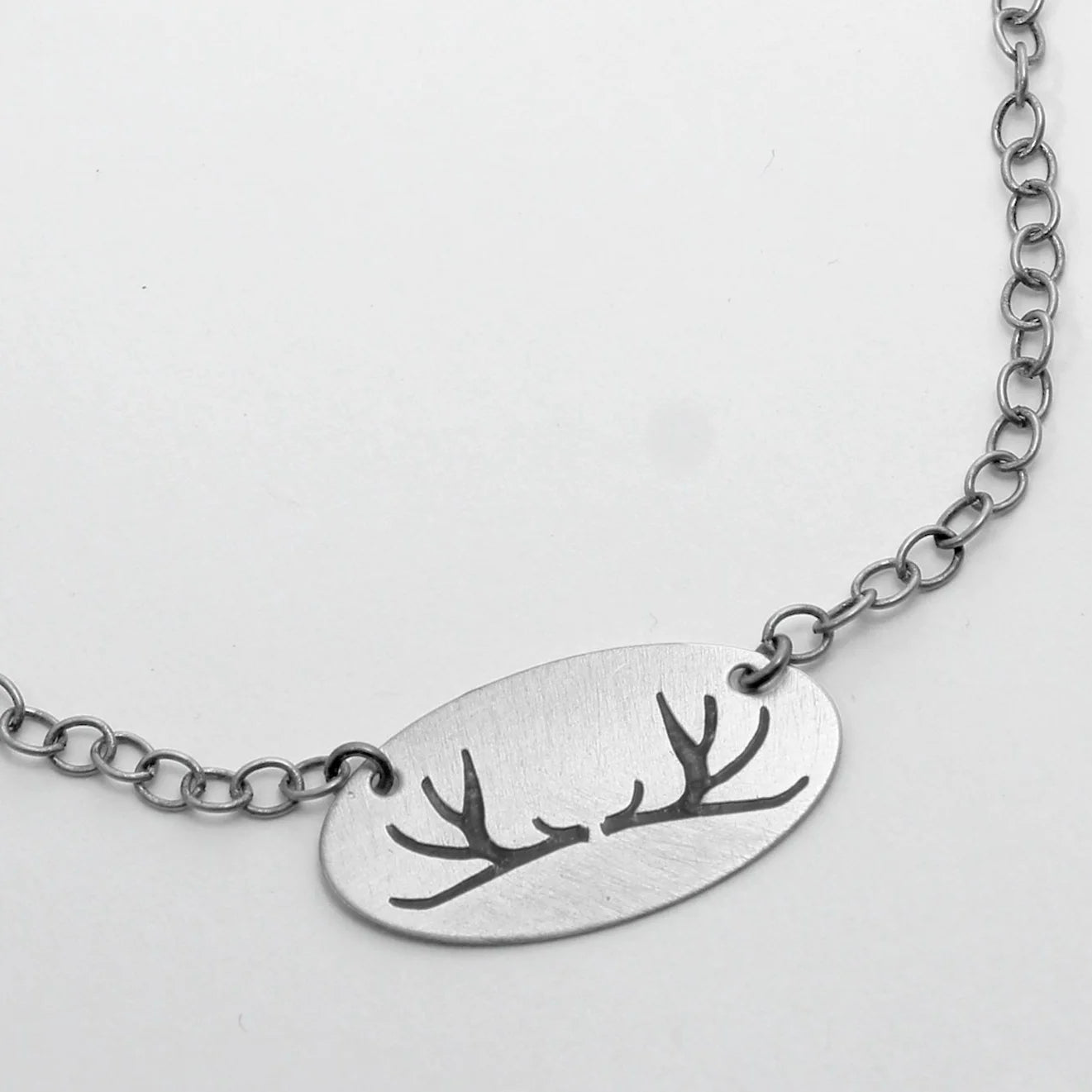 A simple set of antlers etched into a thin oval shape.  This necklace will make a great gift for your hunting friends, a nature lover, or anyone who loves wild places.  The pendant is .67” by 1.22”. Comes on either an 18" adjustable cable chain or a 30" adjustable monofilament cord. DAPHNE LORNA // MISSOULA
