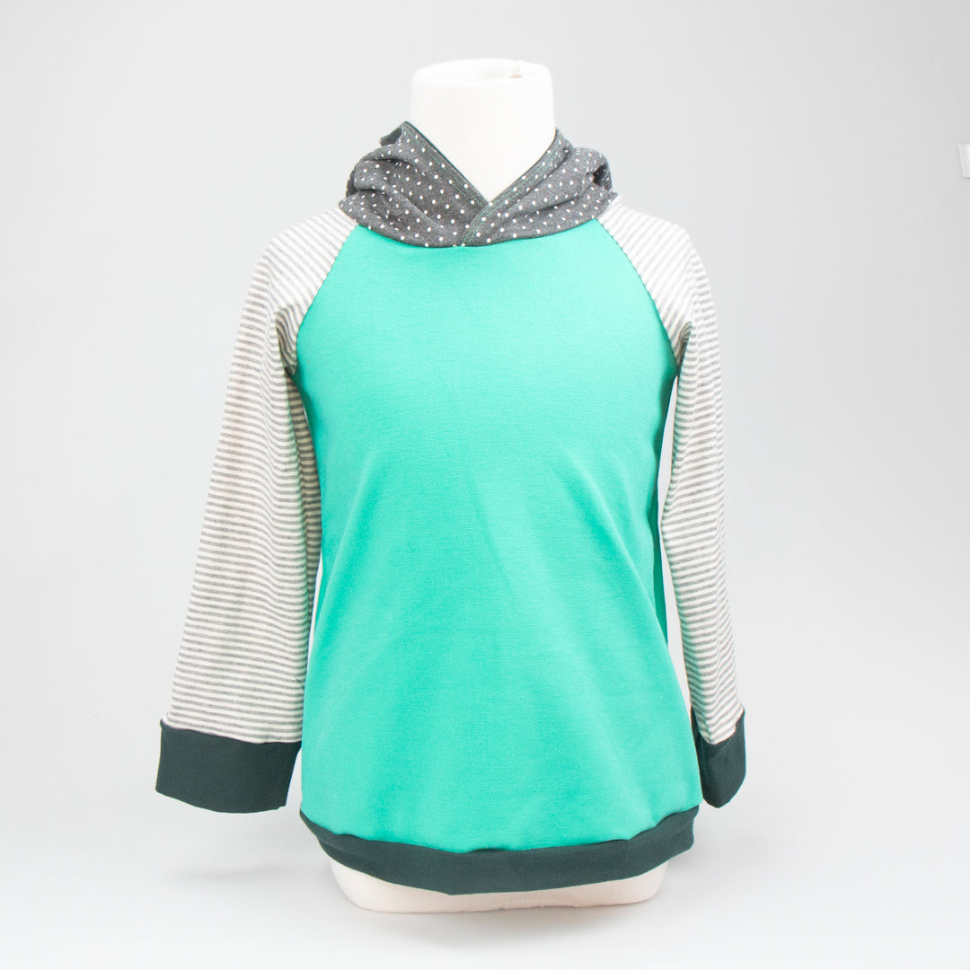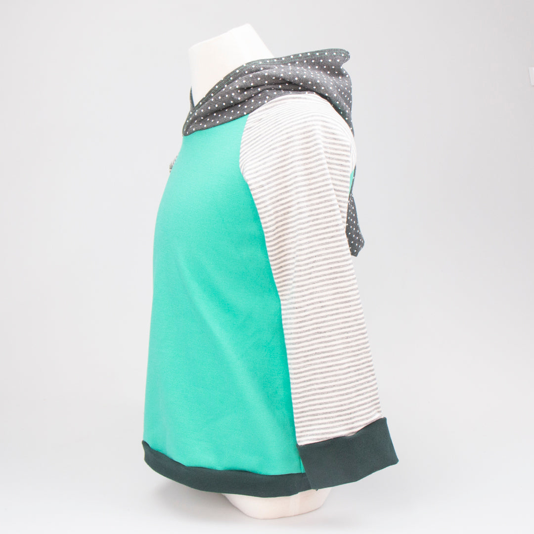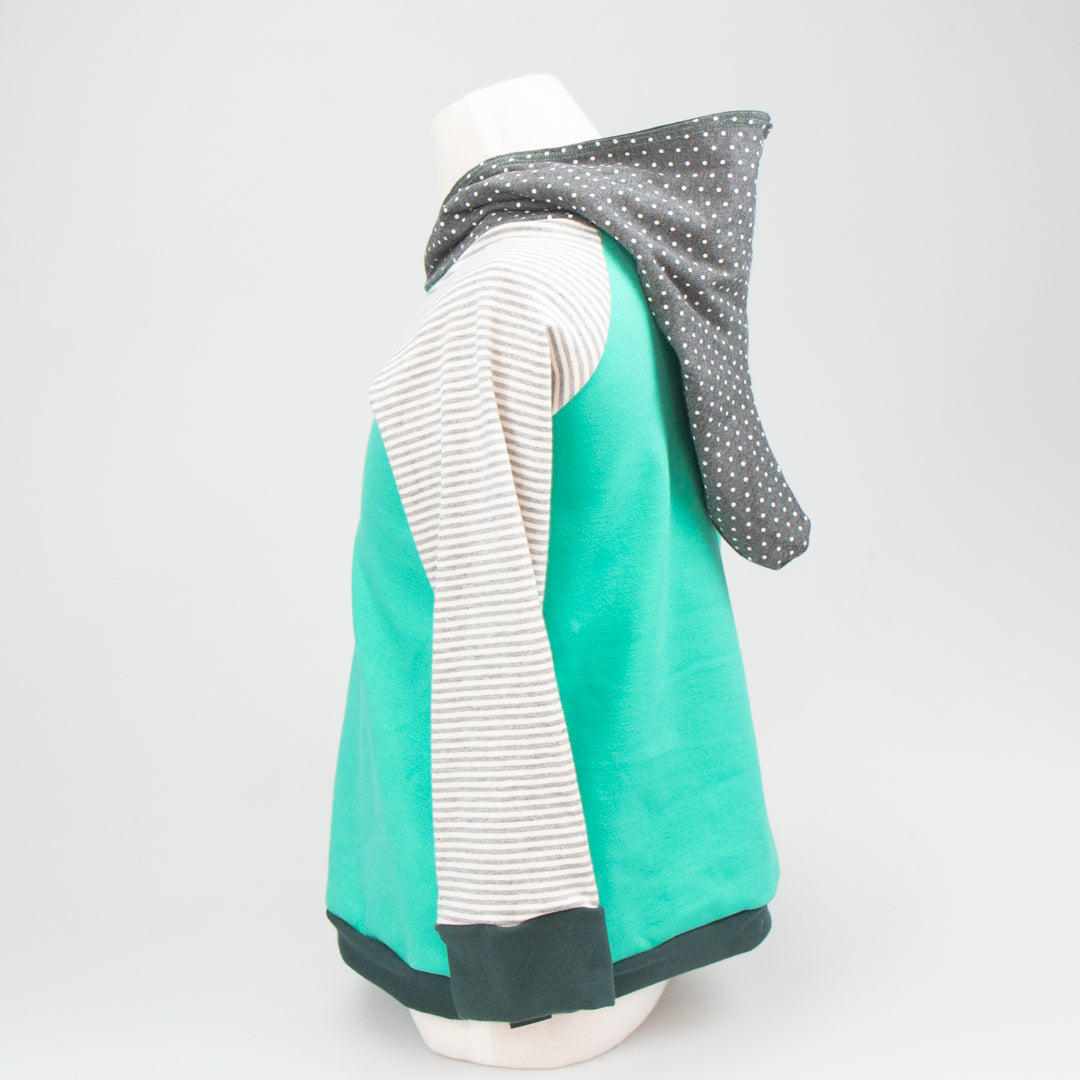 It's the go-to hoody for both lads and lasses. This pullover Elf Hoodie features a lined, pointy hood and contrasting sleeve cuffs. A generous fit allows the hoodie to be worn for an extended period before it is outgrown and passed on. Your little one will stand out in the crowd. Made in Montana from upcycled deadstock fabric, this hoodie blends sustainability with style. If you are looking for older sizing, check out the Joey Hoodie!