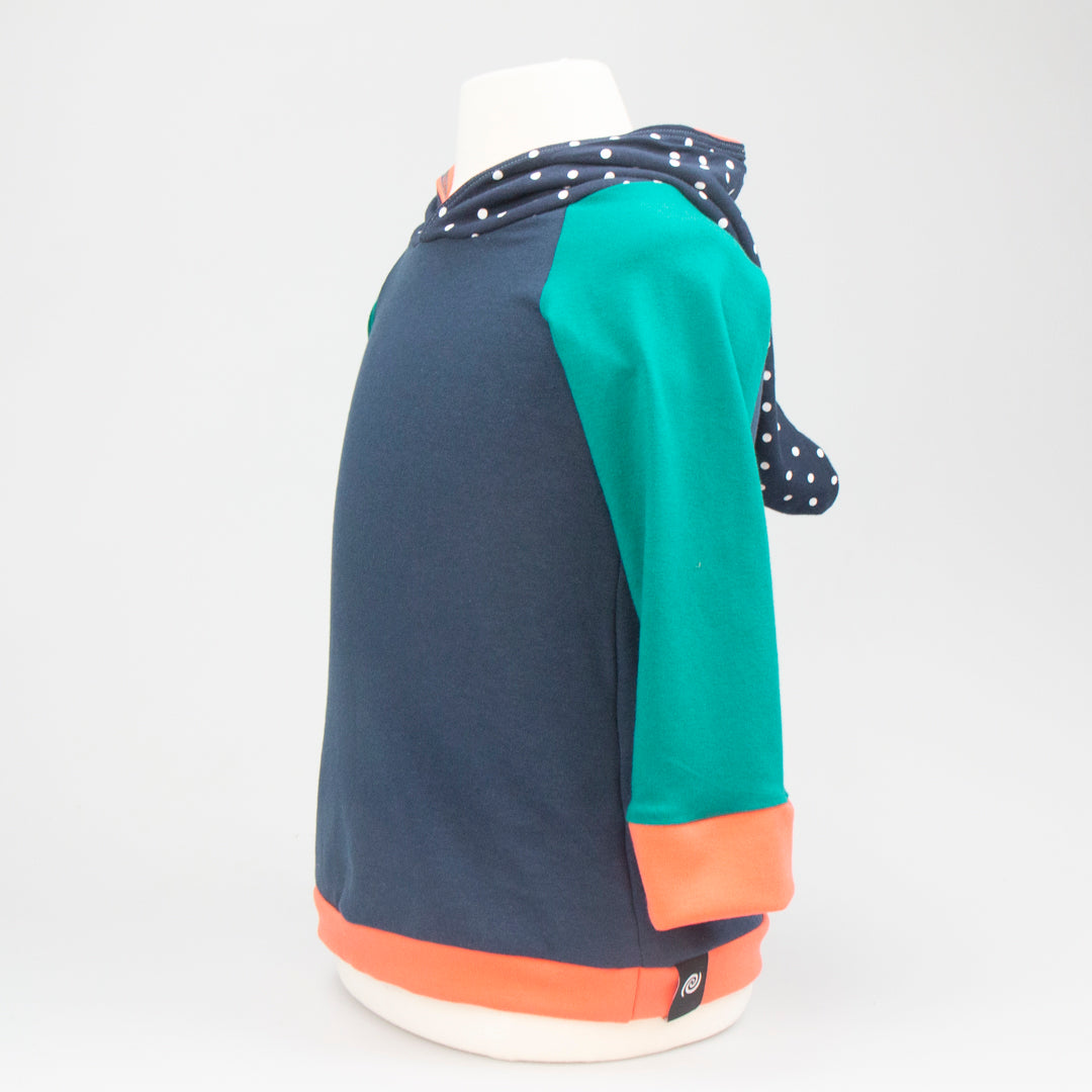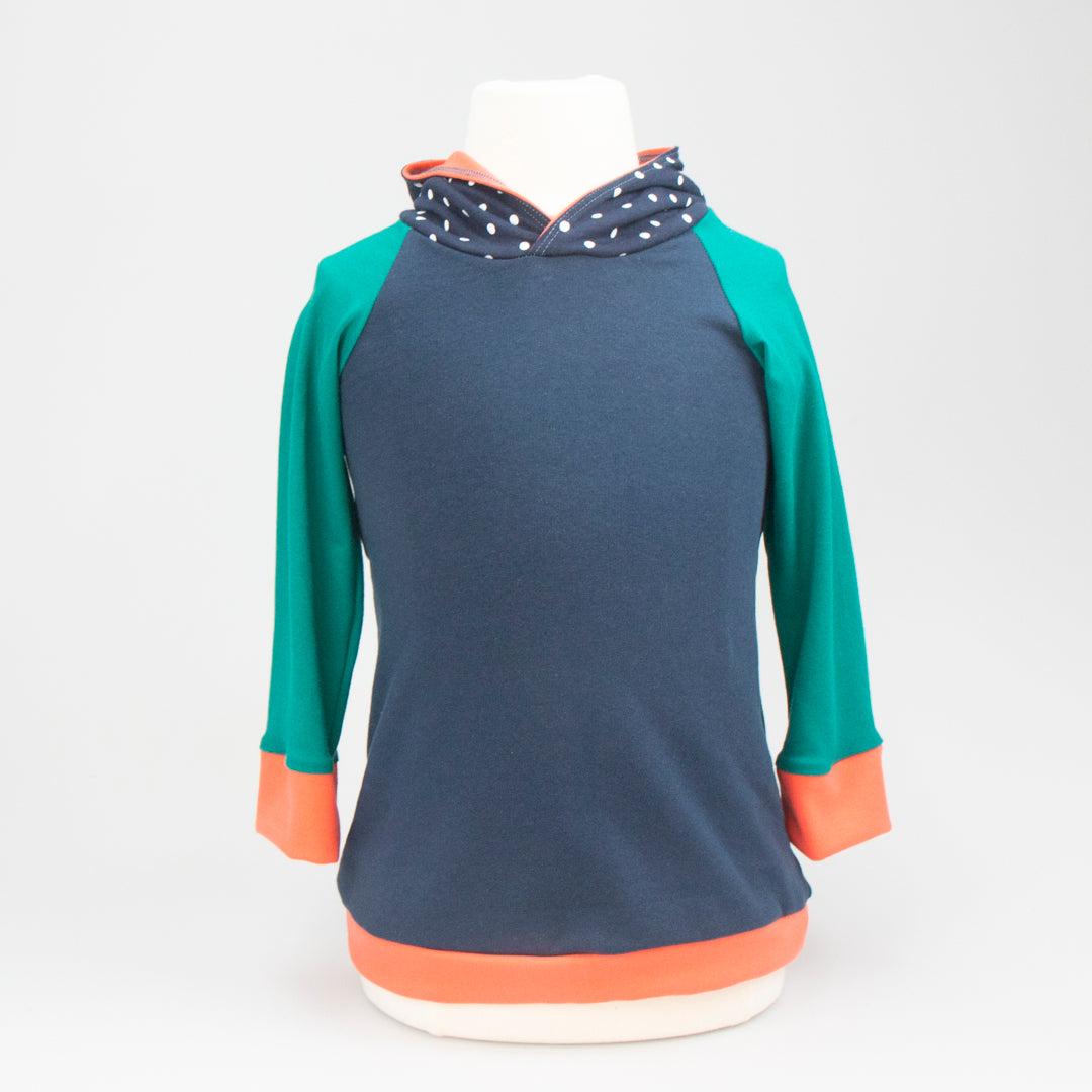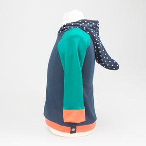 IIt's the go-to hoody for both lads and lasses. This pullover Elf Hoodie features a lined, pointy hood and contrasting sleeve cuffs. A generous fit allows the hoodie to be worn for an extended period before it is outgrown and passed on. Your little one will stand out in the crowd. Made in Montana from upcycled deadstock fabric, this hoodie blends sustainability with style. If you are looking for older sizing, check out the Joey Hoodie!