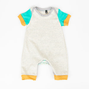 Say hello to your new baby essential! These adorable short-all rompers are a must-have, featuring lapped shoulders, a cozy crew neck, a contrasting butt gusset, and easy-to-use resin snap closures for quick changes. Available in playful unisex and girl-friendly color combos, they're guaranteed to steal the show at your next family gathering. Crafted in small, exclusive batches (think microbrewery vibes!) from upcycled deadstock fabric, they're as sustainable as they are stylish.