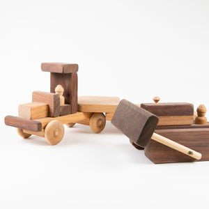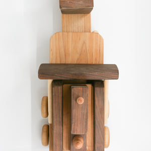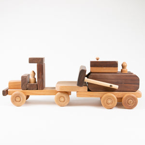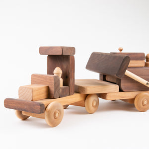 This classic, handmade, wood, three-piece Bulldozer Truck unit has a truck cab with a driver and a low-boy trailer that detaches from the truck with a peg/hole combination.  The “stubby” Bulldozer also has a driver.  This classic Bulldozer is a real worker since the blade moves up and down.