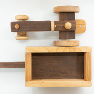 Our toy farm Tractor and Wagon is made of walnut and oak. The hardwood wagon is detachable from the toy tractor by a wood peg which slips into a hole on the tractor.  The farm tractor is sturdy enough to haul anything the would-be farmer needs to transport.