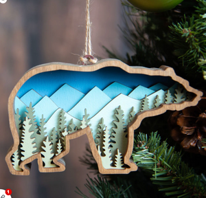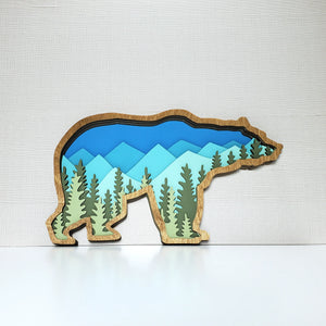 The details in this wood layered bear art piece are amazing. It will look great in your home, office or cabin. The seven layers are each a distinctive color that blend together in a series of blue and greens to create depth and dimension.