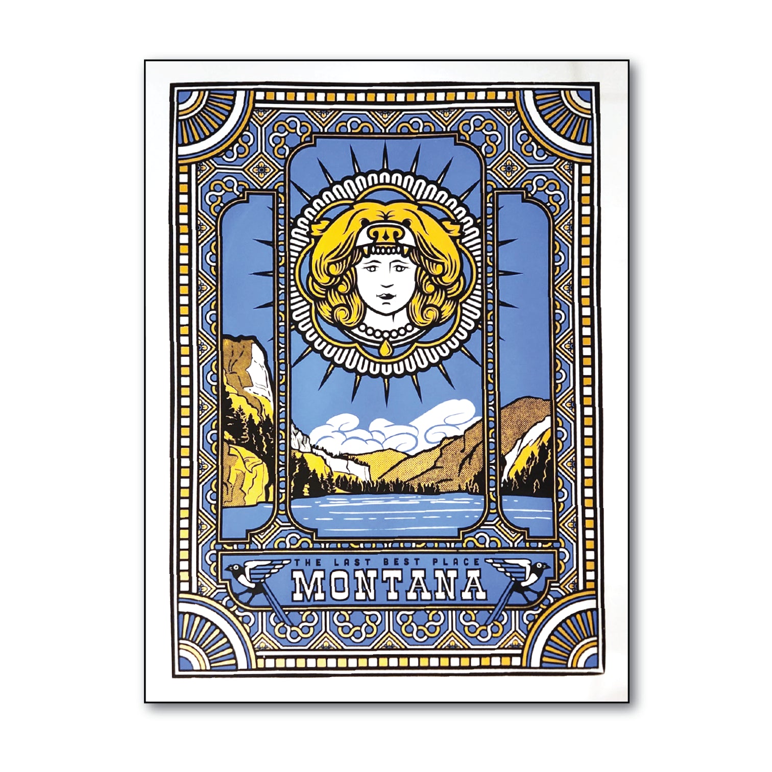 A limited-edition poster print with a handcrafted, halftone aesthetic—designed and screenprint out of the Goodson Designs' home studio in Helena, Montana. The prints feature ornate designs with a Western subject matter and a unique vision of what makes Montana Big Sky Country.
