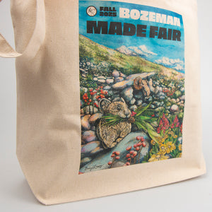 Level up your market-day look with this high-quality Bozeman Fall MADE fair tote bag, featuring exclusive event artwork by Bizzy Lizzy Ink. This year’s design celebrates the beauty of Bozeman’s wild landscapes—complete with mountain views, native blooms, and a curious pika gathering its alpine snacks.